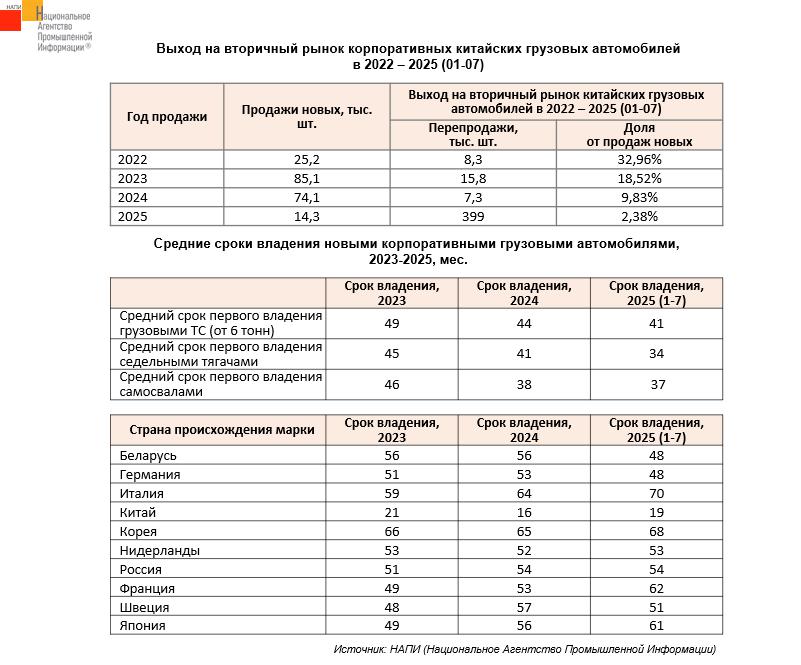 Сроки владения после первой продажи сильно разнятся в зависимости от страны происхождения грузовика. Статистика показывает, что у машин российских и некоторых европейских марок сроки владения напротив выросли. Снизились сроки владения у белорусских, немецких и китайских большегрузов; судя по всему, последние за счёт своего преобладания на рынке и стали причиной столь ощутимого снижения общих показателей.