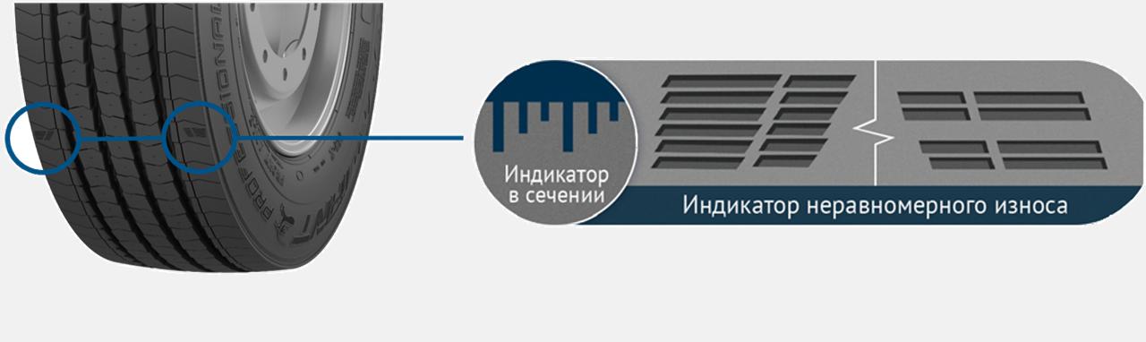 Также в рисунке протектора шин Cordiant Professional FR-2 реализованы специальные индикаторы прикатки, которые позволяют выявить неравномерный износ и предотвратить преждевременный выход шин из строя на ранних этапах эксплуатации путем ротации или регулировки подвески.