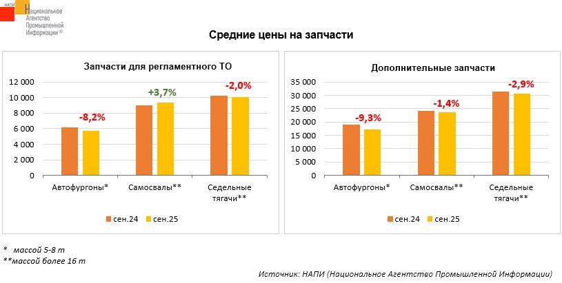 Запчасти для регламентного техобслуживания седельных тягачей подешевели на 2%, а запчасти для фургонов массой 5-8 тонн подешевели на 8,2%. В то же время детали для самосвалов подорожали на 3,7%.