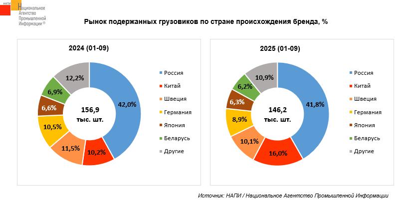 Лидером вторичного рынка остаются российские большегрузы (41,8% от общего числа реализованных машин). На втором месте по объёму продаж грузовики из Китая (16%), а на третьем — из Швеции (10,1%).