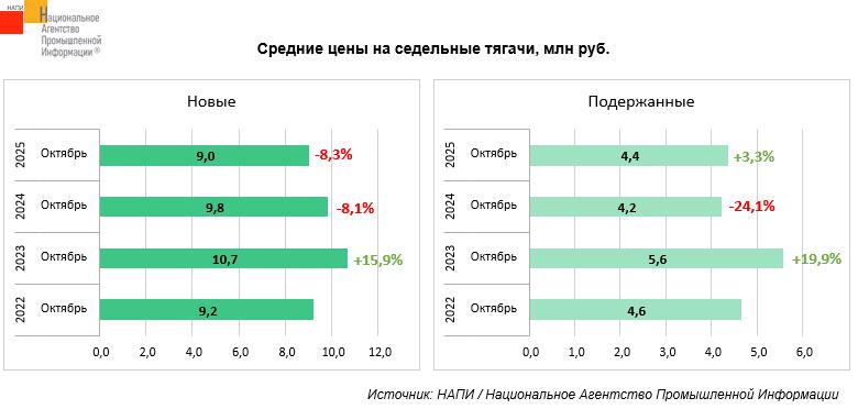 Средняя стоимость тягача с пробегом (возрастом не старше 20 лет) в октябре 2025 года составляла 4,3 млн рублей, за 12 месяцев такие машины подорожали на 3,3%. Средняя стоимость тягача с пробегом в 2022 году составляла 4,6 млн рублей.