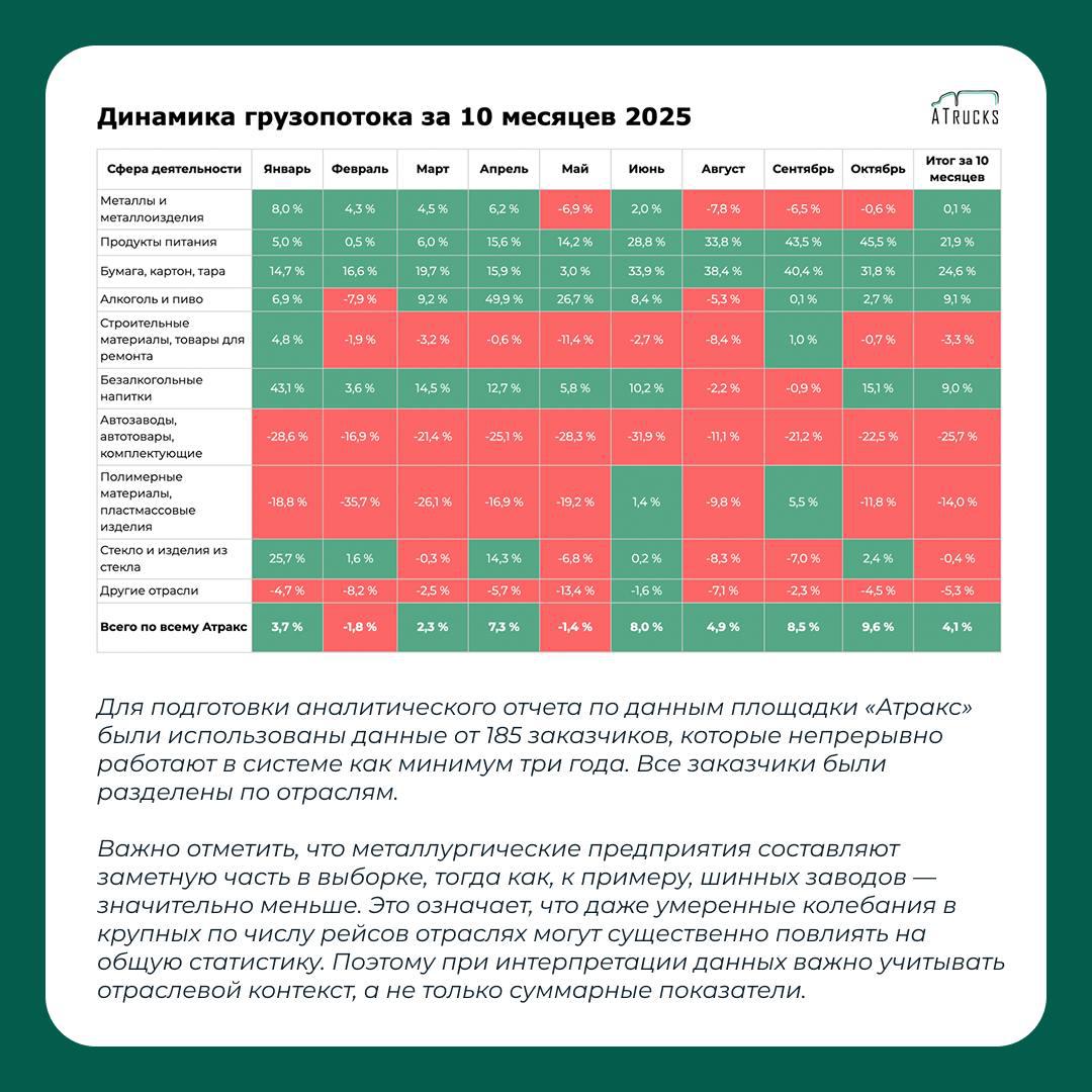 Эксперты Atrucks отмечают, что положительная динамика грузопотока формируется во многом благодаря сектору товаров повседневного спроса. Спрос на промышленную продукцию, напротив, демонстрирует сдержанную динамику. Октябрьская статистика позволяет ожидать сохранения положительной динамики в IV квартале, а сезонность может обеспечить умеренный рост по итогам года.