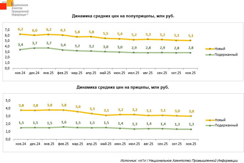 Средняя стоимость новых полуприцепов с ноября 2024 по ноябрь 2025 года снизилась на 18,6% и сегодня составляет 5,1 млн рублей. Подержанные (не старше 20 лет) полуприцепы подешевели на 16,6%, до 2,8 млн рублей.