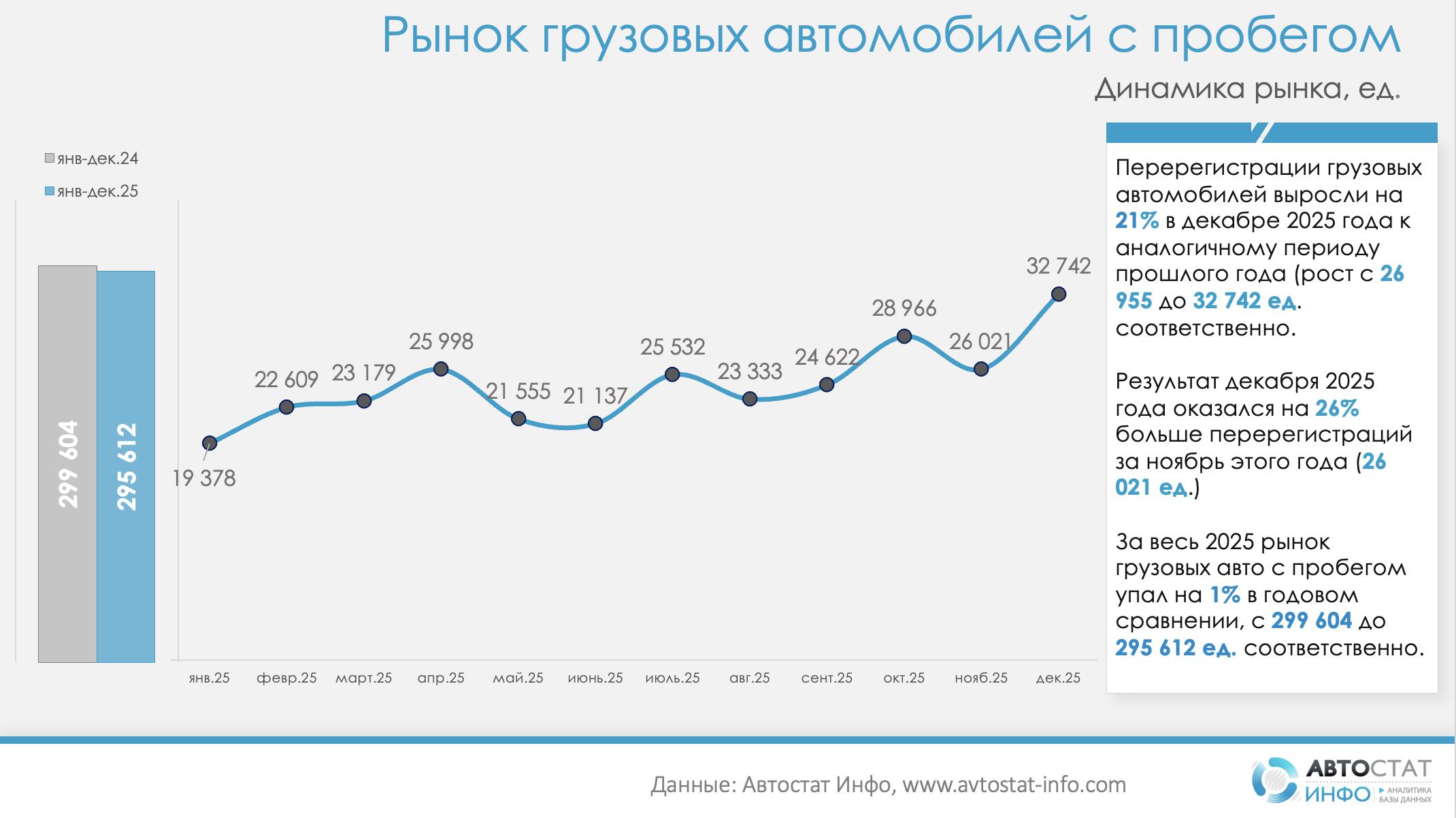 По итогам года рынок подержанных грузовиков снизился всего на 1%. При этом в декабре количество перерегистраций достигло 32 742 единиц, что на 21% больше, чем в декабре 2024 года, и на 26% больше, чем в ноябре 2025-го.