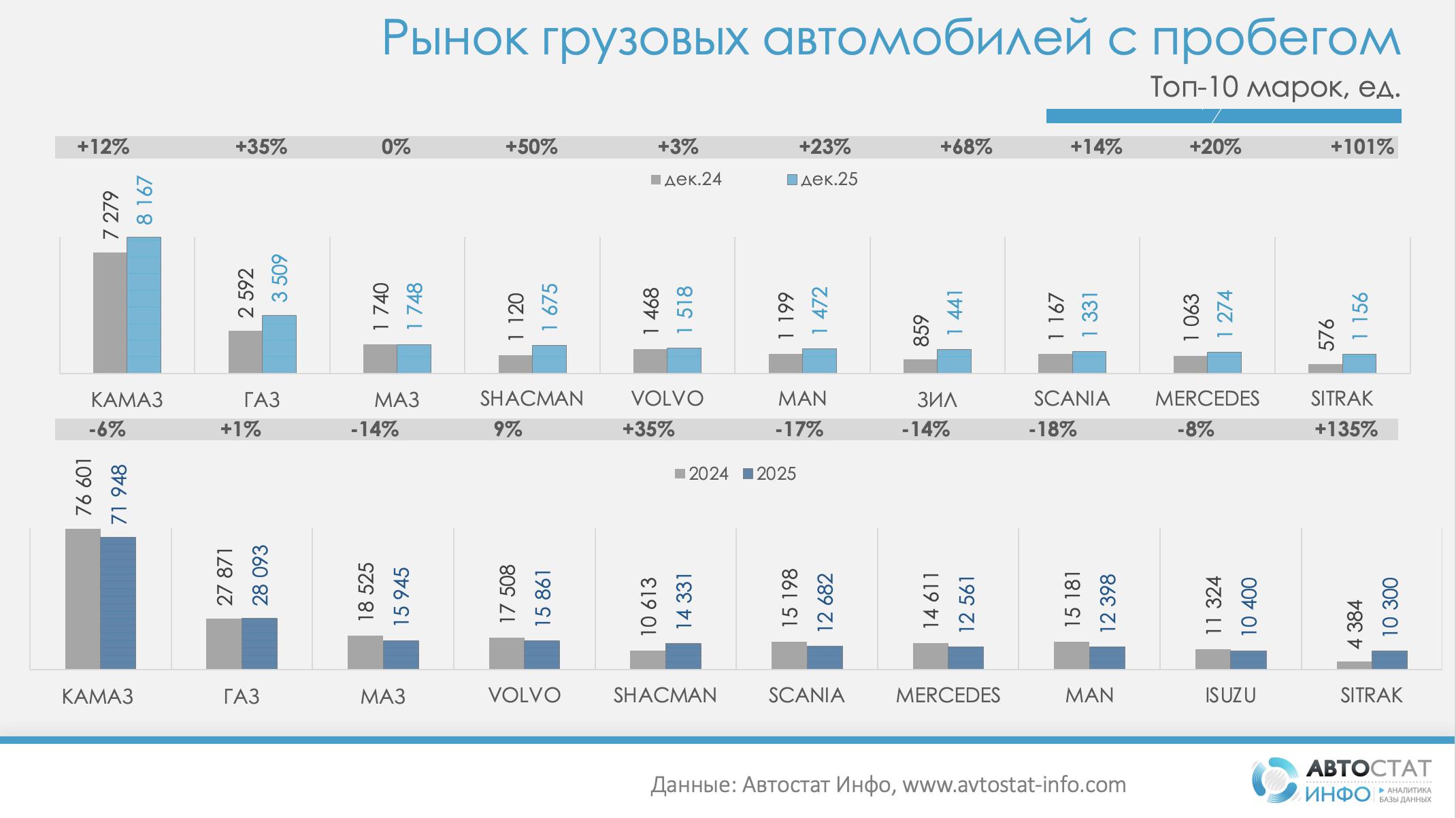 Лидером вторичного рынка остается КАМАЗ. Второе место по объему продаж занимает ГАЗ, третье — МАЗ. В топ-10, помимо китайских марок, входят и европейские бренды: Volvo, Scania, Mercedes, MAN. Примечательно, что по итогам декабря в десятку самых востребованных марок попали грузовики уже несуществующего Завода имени Лихачёва (ЗиЛ) — за месяц был продан 1441 автомобиль этой марки.