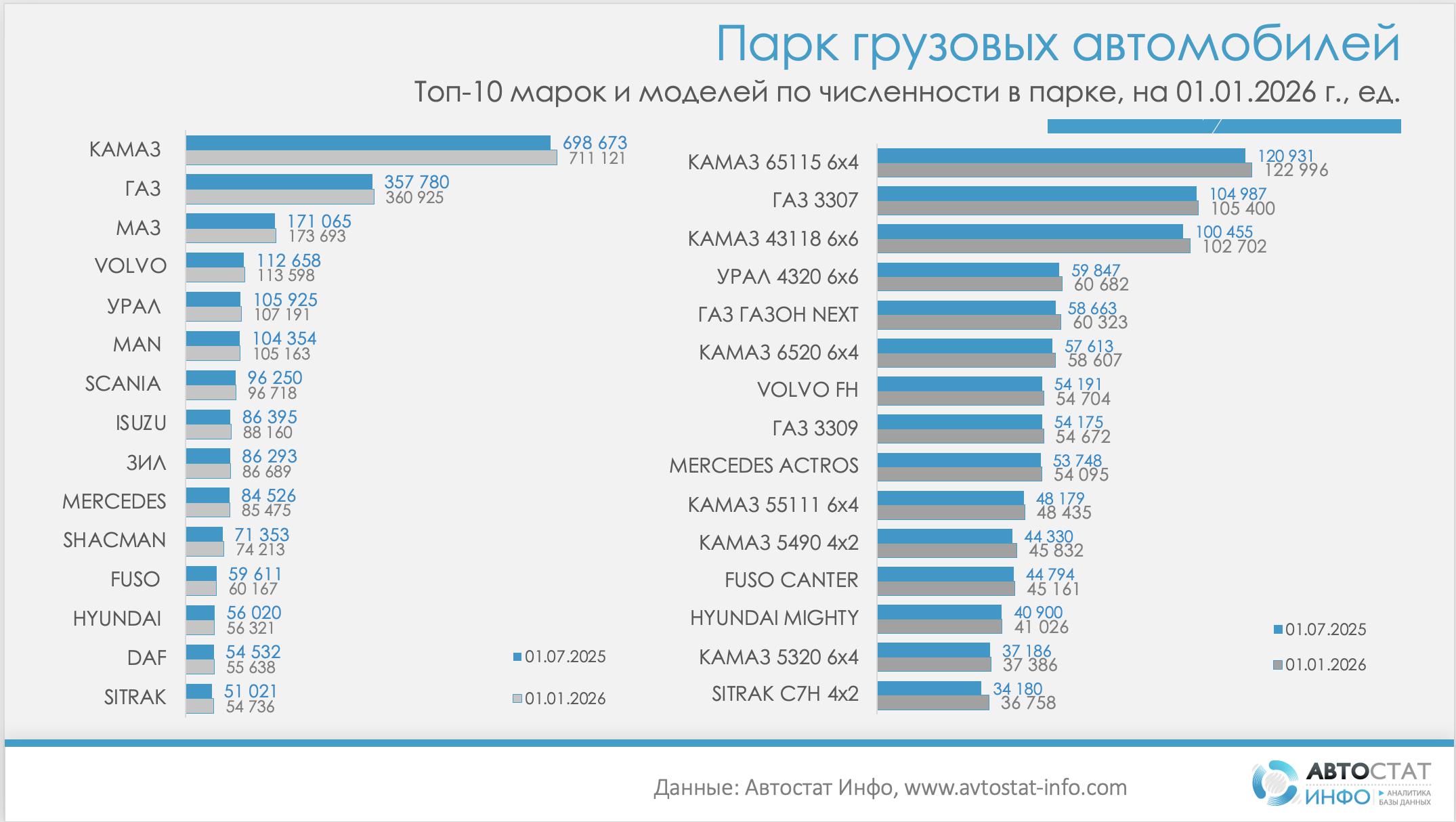 Абсолютным лидером марочного рейтинга остаётся КАМАЗ: на него приходится четверть от общего количества грузовиков. Тройку лидеров замыкают ГАЗ и МАЗ, а четвёртое место занимает европейский производитель Volvo.