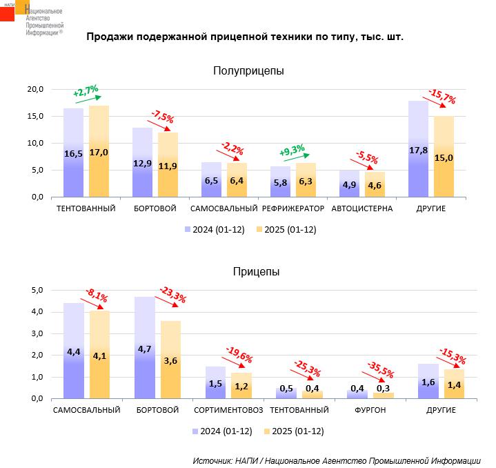 Несмотря на общий спад, продажи полуприцепов некоторых типов выросли. Это тентованные (+2,7%) и рефрижераторные (+9,3%) полуприцепы. В то же время продажи бортовых полуприцепов сократились на 7,5%, самосвальных — на 2,2%, а автоцистерн — на 5,5%.