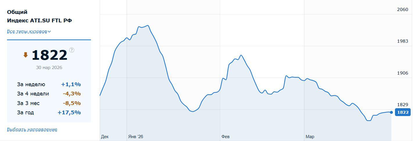 Данные Индекса ATI.SU позволяют предположить, что у мартовского снижения ставок может быть ещё одна причина. До 2023 года март считался месяцем, когда ставки начинают расти после зимнего затишья. В 2024 и 2025 годах тарифы в марте падали, и в 2026 году ситуация вновь повторилась. Возможно, рынок столкнулся со сдвигом в сезонности, причинами которого могут быть как макроэкономические факторы, так и уже упомянутый избыток транспорта.