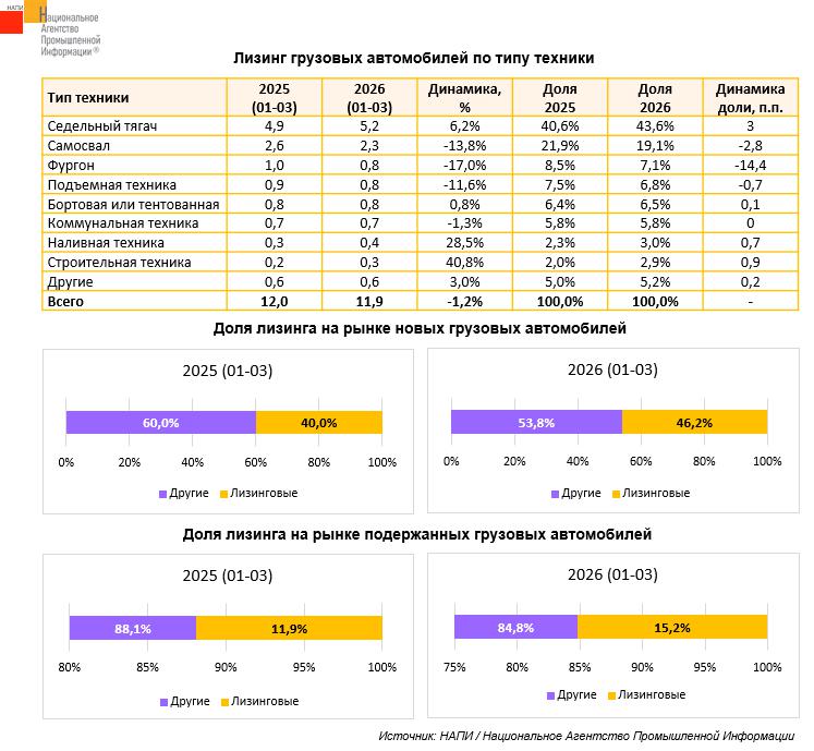 За первые три месяца 2026 года выросли объёмы выдачи в лизинг строительной (+40,8%) и наливной (+28,5%) техники. Лизинг фургонов и самосвалов, напротив, сократился на 17% и 13,8% соответственно.